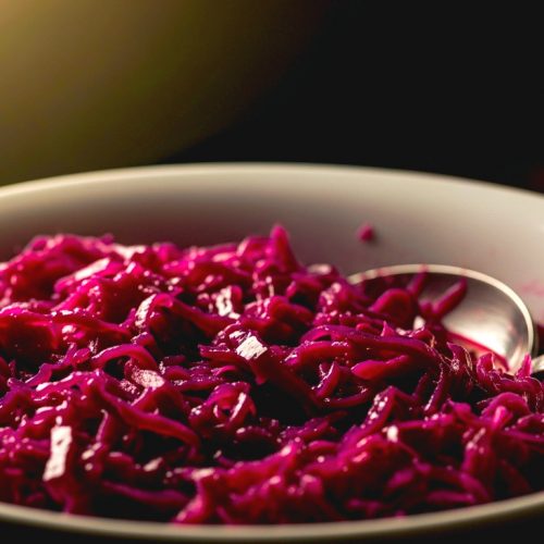 Apfelrotkohl, sometimes called Rotkraut (or even Blaukraut in Southern Germany referring more to the bluish than red color), is a traditional German side dish made by slowly braising red cabbage with apples, vinegar, sugar, and aromatic spices until tender and glossy. Every family has its own twist — some use red wine, others a splash of fruit jelly or apple juice for depth and sweetness.